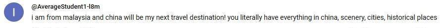 我来自马来西亚,中国将是我的下一个旅游打算地!中国简直领有一切,局势、城市、历史古迹。