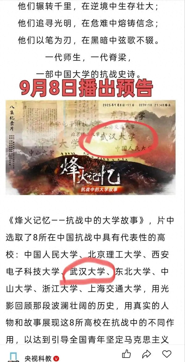 记录片原定 9 月 8 日起在 CCTV-10 每晚 21:48 播出,领先官宣的 8 所高校包括武汉大学、中国东说念主民大学、浙江大学等。可就在开播前几天,有眼尖的网友发现,预报片里武大的镜头没了,官网上的名单也偷偷改成了 7 所,中国东说念主民大学顶了上来。更绝的是,之前宣传时武大仍是 \"C 位\" 亮相,当今却像被 \"一键删除\",连个施展皆莫得。这操作让不少东说念主懵了:好好的大学若何说删就删了?