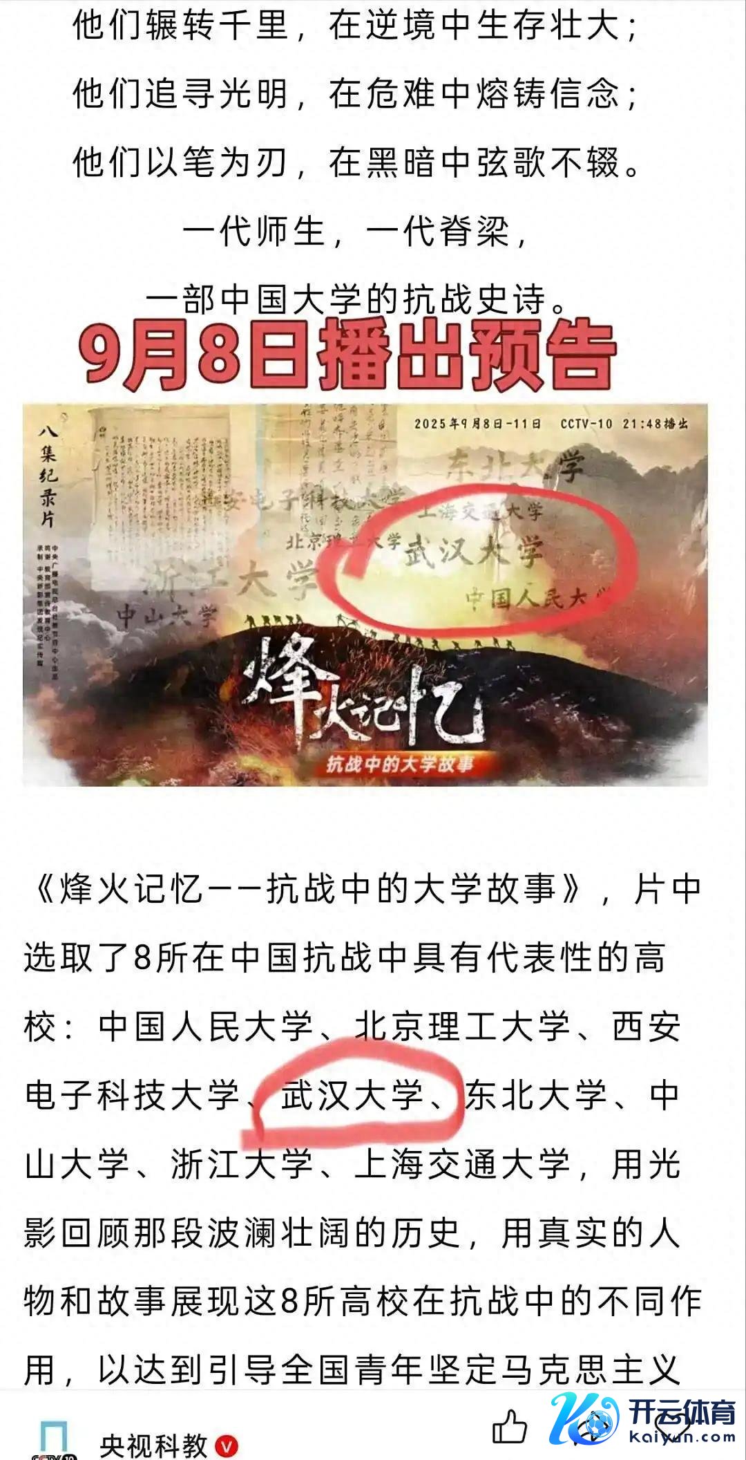 最近刷到条让东说念主唏嘘的新闻:央视全心制作的抗战记录片《燃烧记念 —— 抗战中的大学故事》立地要开播了,可真贵的网友发现,原来官宣的 8 所高校名单里九游体育app娱乐,处于C位的武汉大学,斯须不见了,镜头更是被剪得鸡犬不留,东说念主没了。