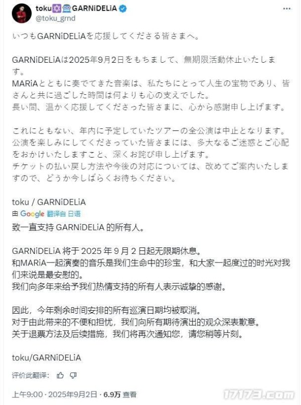 曾以《极乐净土》风靡全球的日本音乐组合GARNiDELiA成员toku本日通过酬酢媒体告示,自9月2日起将无尽期休团,并取消本年扫数巡演安排。